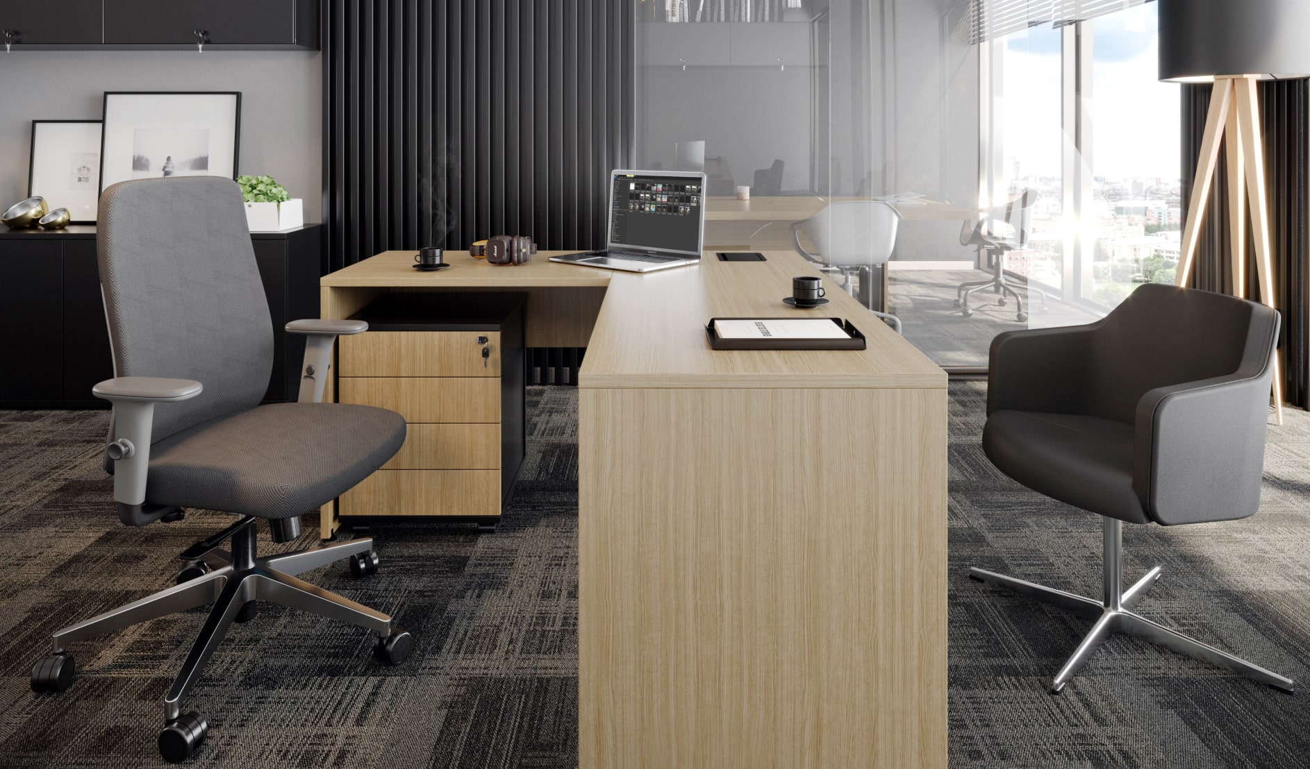 A combinação de tampos com cantos arredondados e pés cônicos cromados tornam o ambiente executivo elegante e sofisticado. A mesa composta por dois tampos de acabamentos diferentes, com caixa de tomadas embutida e de fácil acesso e cabeamento sob eles, é a principal característica da linha. Acompanha esta mesa uma linha completa de armários com portas e gavetas que também contam com pés cônicos, garantindo, assim, unidade visual ao conjunto.
