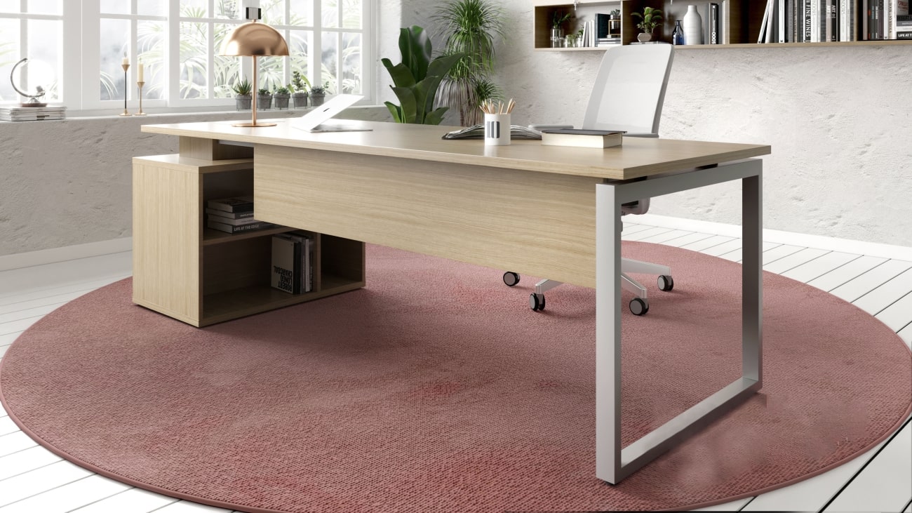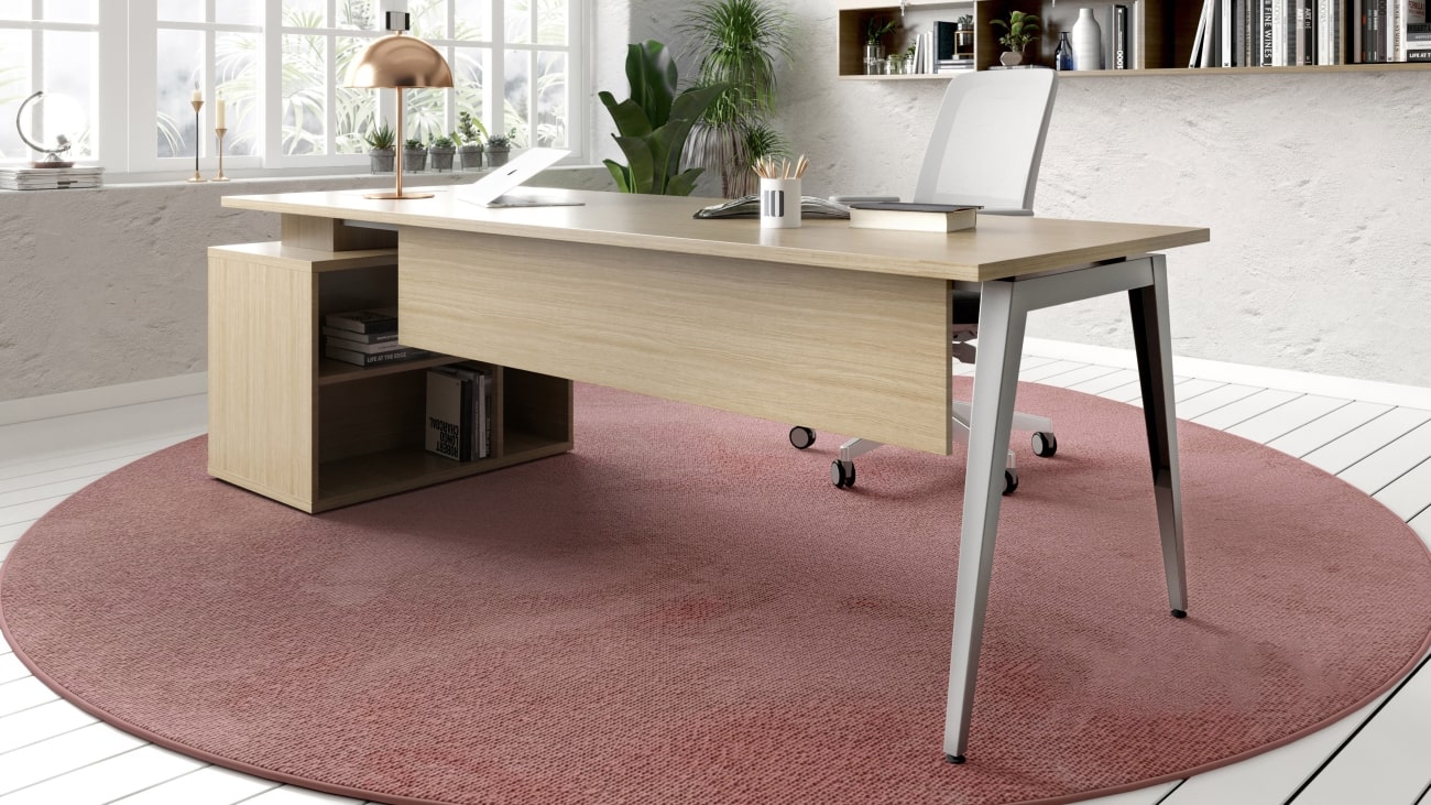 A mesa com pé esquadro apresenta ao ambiente de trabalho um aspecto de robustez e força, necessária para todos os líderes modernos. O painel frontal recuado oferece privacidade ao usuário, durante o dia de trabalho. Painel em laminado liso ou madeirado, fixado sob o tampo.